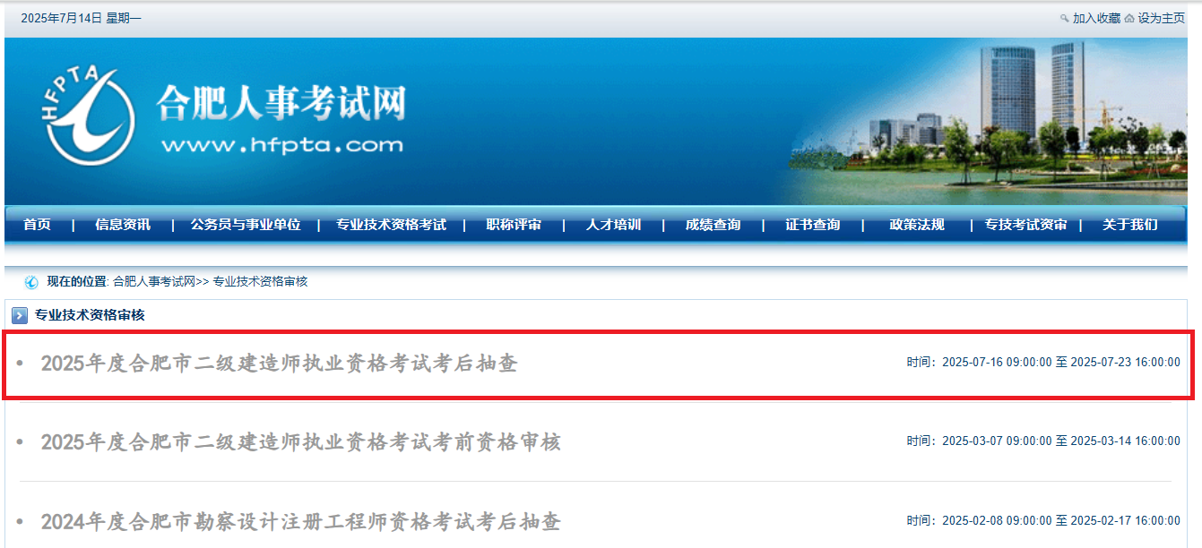根據(jù)專業(yè)技術(shù)人員職業(yè)資格考試報名證明事項(xiàng)告知承諾制有關(guān)要求,擬于近期開展合肥考區(qū)2025年度二級建造師執(zhí)業(yè)資格考試成績合格人員踐諾情況抽查工作,現(xiàn)將有關(guān)情況通知如下。