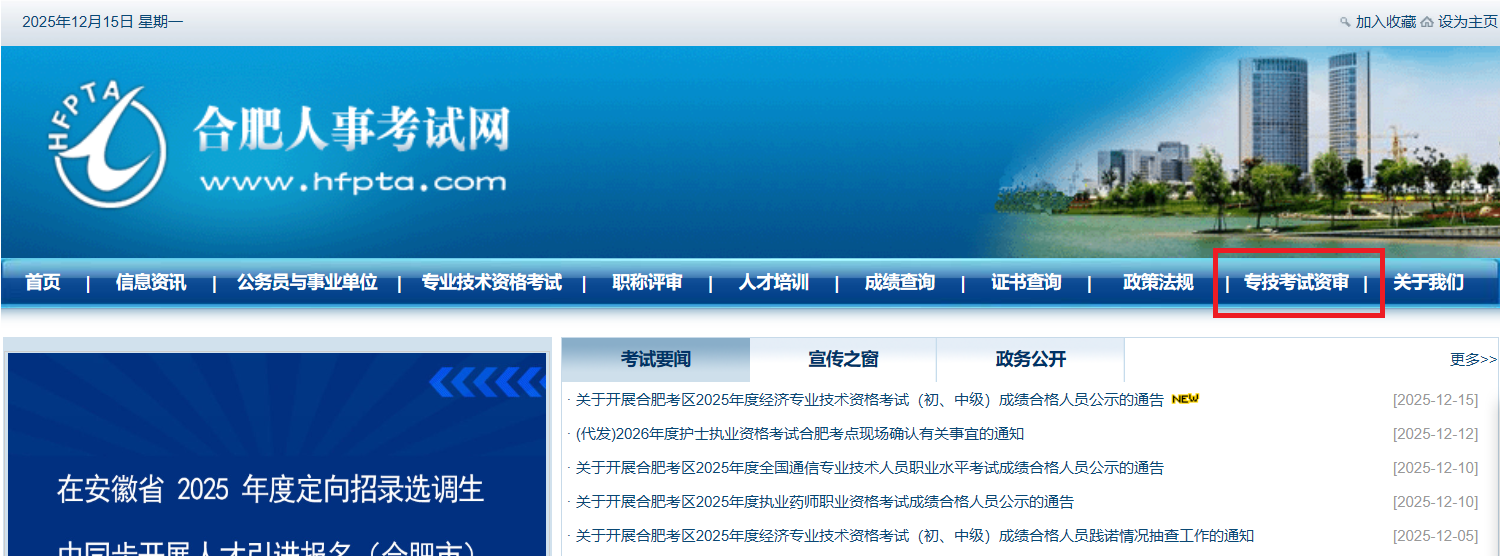 1、登錄合肥人事考試網(wǎng)(wjjxw.com)點(diǎn)擊“專技考試資審”欄目(如附圖1)。