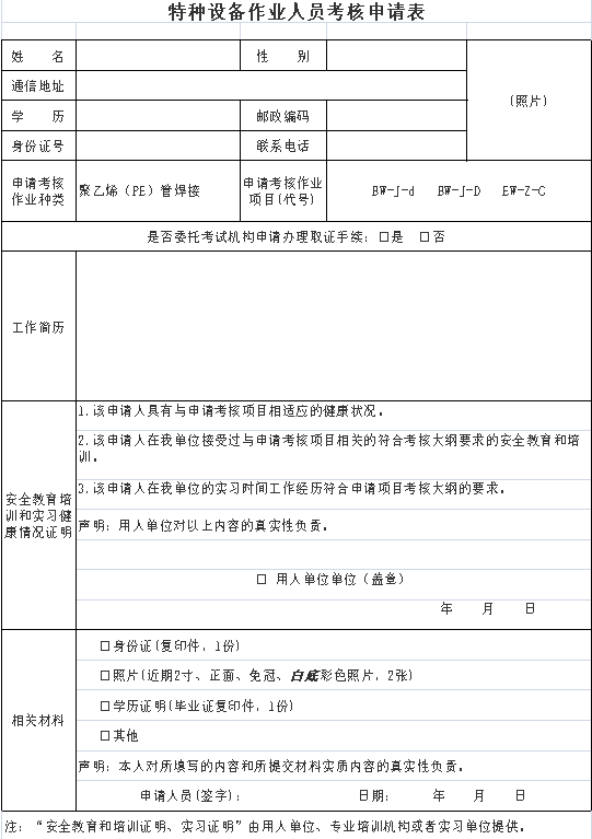 1、參加培訓(xùn)考證人員,請(qǐng)如實(shí)填寫特種設(shè)備焊接操作人員考試申請(qǐng)表1份,加蓋單位公章;