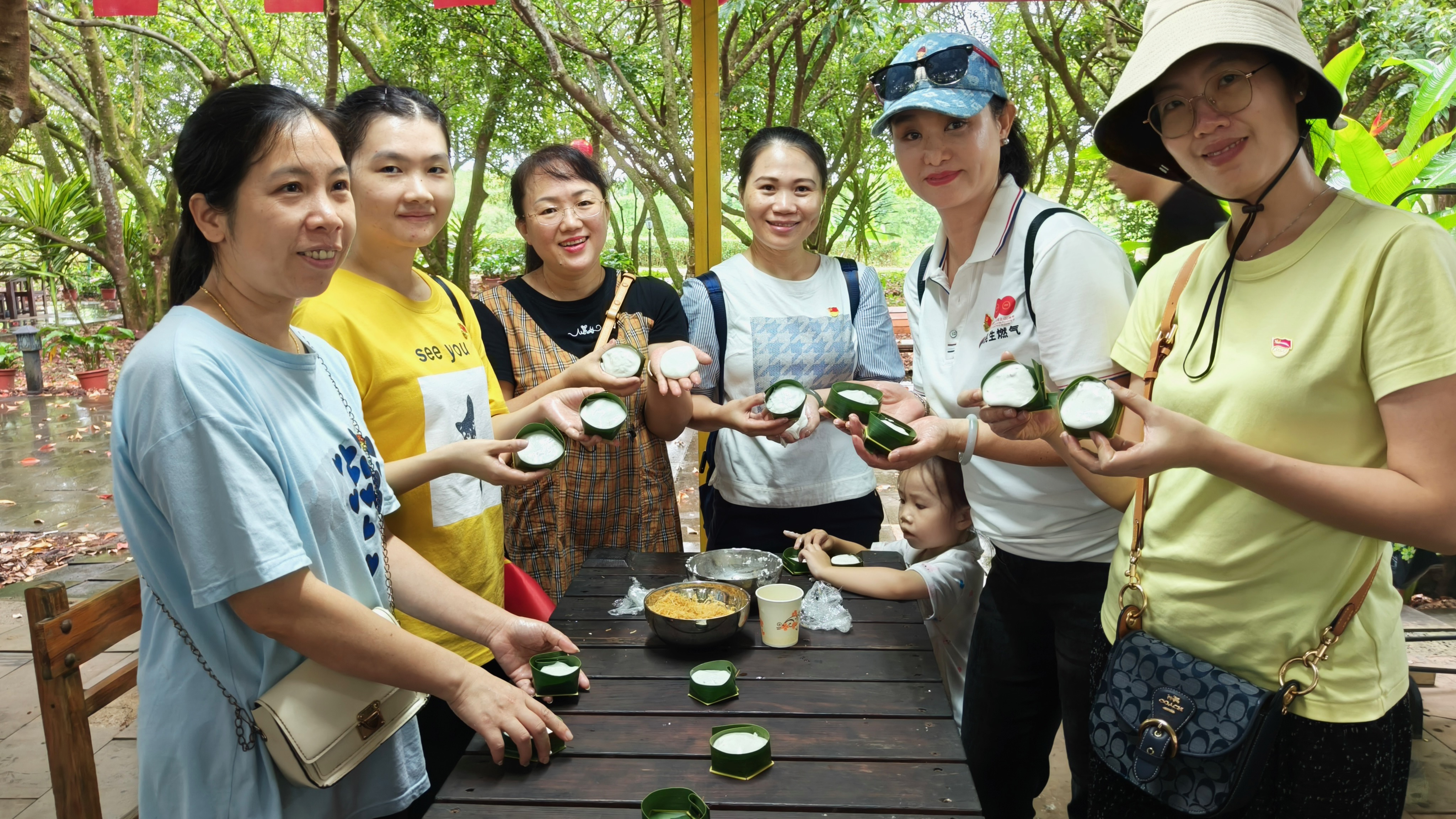 在鄉(xiāng)村振興示范村馮唐村,黨員同志們在導游的帶領下游覽橄欖園、龍棲谷棧道與國學堂,并與當地村民一道制作椰子餅與糯米團等特色小吃,深入體驗了綠色鄉(xiāng)村的活力與生機。